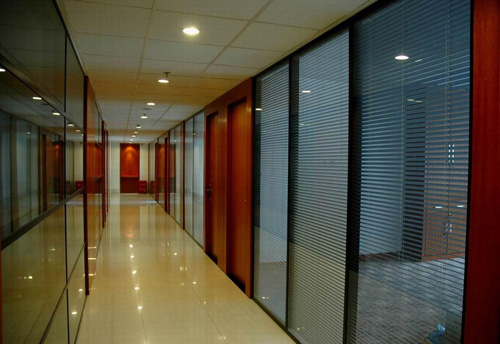 铝百叶窗帘,可以调整叶片的角度来调节光线,这样既保护了办公室的私密性又可以观察到外面的工作情况。这样的隔断既区分不同性质的工作空间,又能使办公室环境富于变化。它营造了一种似隔非隔,似断非断的宁静空间。