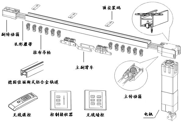 黄色草莓视频下载网站由:电机、主副传动箱、滑轮和传动皮带组成,一套完整的黄色草莓视频下载网站系统包括:轨道系统、控制系统、装饰布帘。轨道系统采用的驱动方式有直流驱动和交流驱动两种。